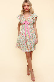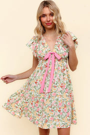 This frolicking florals dress is perfect for twirling through fields of wildflowers. The gathered band V neck and elastic waist create a flattering babydoll silhouette, while the ruffle short sleeves add a touch of whimsy. The contrast ribbon bow detail and side pockets add function and flair.