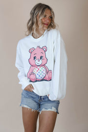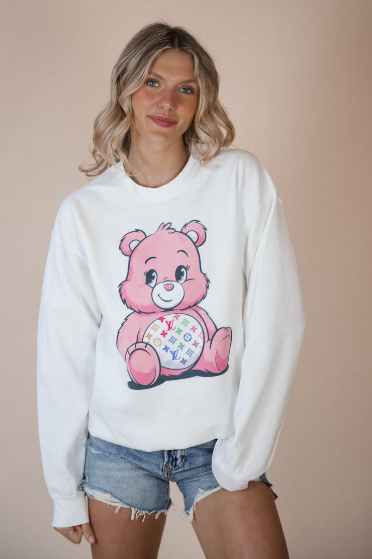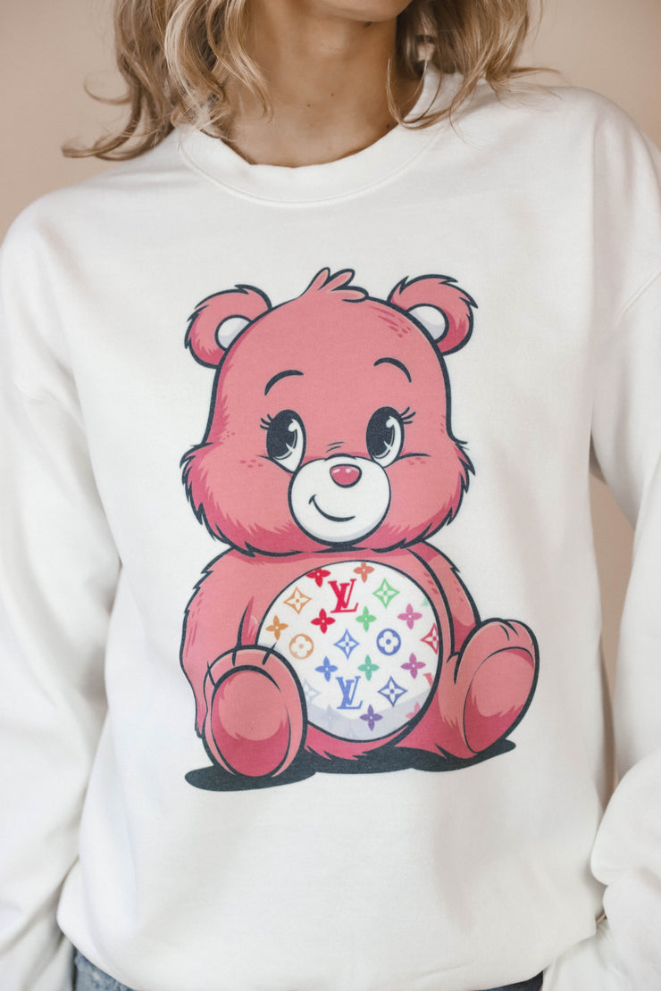 Cuteness overload! This playful crewneck features an adorable pink bear graphic with a designer-inspired twist — a colorful monogrammed belly that gives it that extra charm. Made from a soft and cozy fabric, it's perfect for layering or rocking solo. The relaxed fit, drop shoulders, and ribbed edges make it an easy go-to for a casual, comfy vibe. Pair it with denim shorts or your fave leggings for a fun, laid-back look.